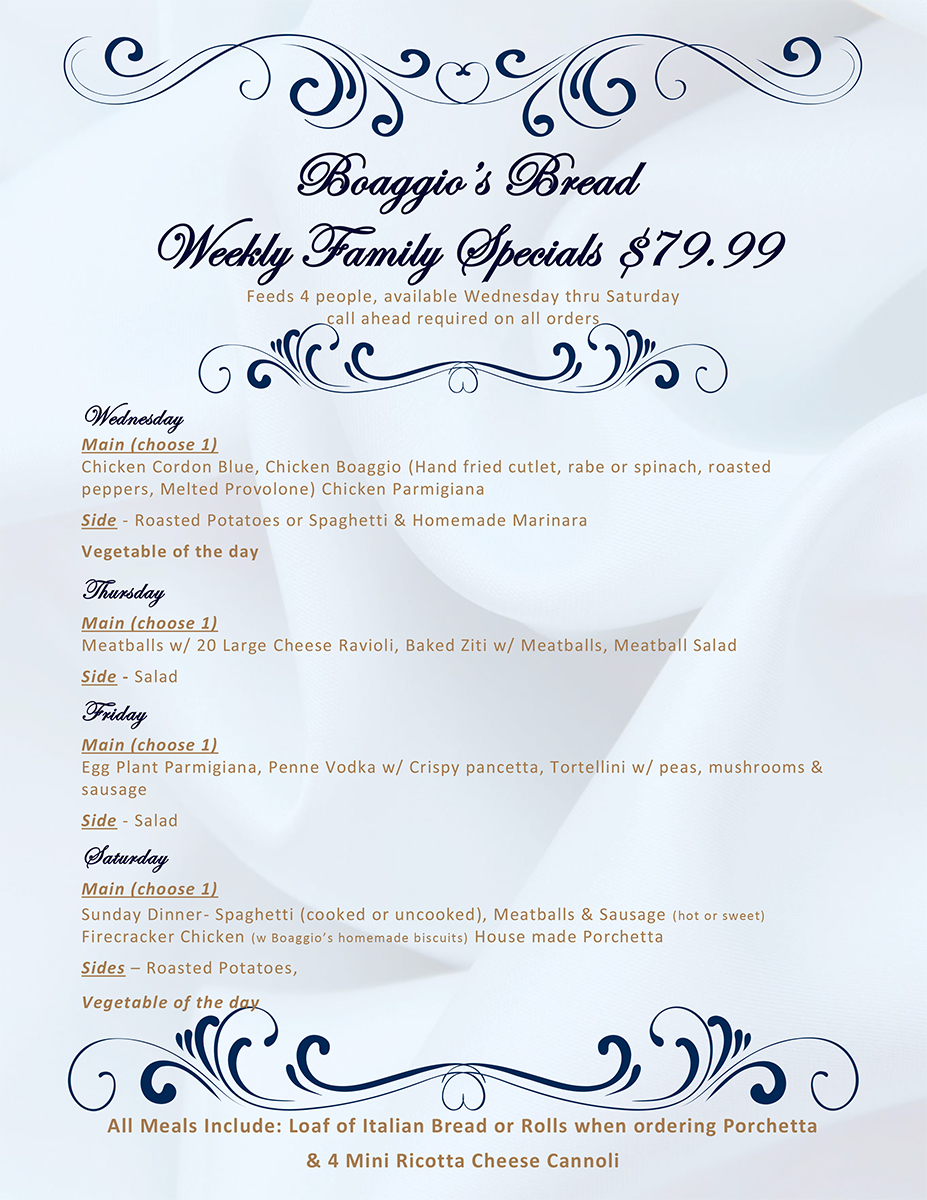 Thanksgiving menu now available here. This is not a go to sit. This is a fantastic little italian bakery and specialty shop. Boaggio's Bread Photos.